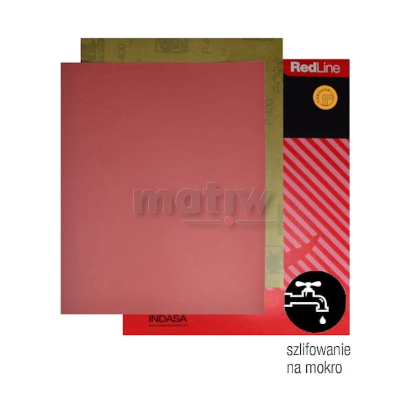 Elastyczny arkusz ścierny Indasa Rhynowet Red Line, na podłożu z wodoodpornego papieru lateksowego, przeznaczony do pracy na sucho i na mokro.