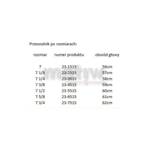 - rozmiar: 7 1/2 (obwód głowy: 60 cm)