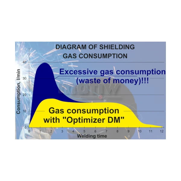 Ekonomizer do gazów osłonowych jest to urządzenie do oszczędzania i optymalnego zużycia takich gazów jak argon, dwutlenek węgla i innych gazów osłonowych. Eliminuje nagły wzrost ciśnienia przy rozpoczynaniu procesu spawania MIG/TIG, utrzymuje stały przepływ i ciśnienie przy układaniu spoiny, umożliwia znaczną (do 50%) oszczędność gazu. Rzeczywiste oszczędności argonu, dwutlenku węgla lub innych gazów osłonowych różnią się w zależności od parametrów odpowiednich procesów spawania MIG lub TIG. Fabrycznie ustawiona wartość ciśnienia wyjściowego to 0,7 bar przy maksymalnym natężeniu przepływu 25 l/min.