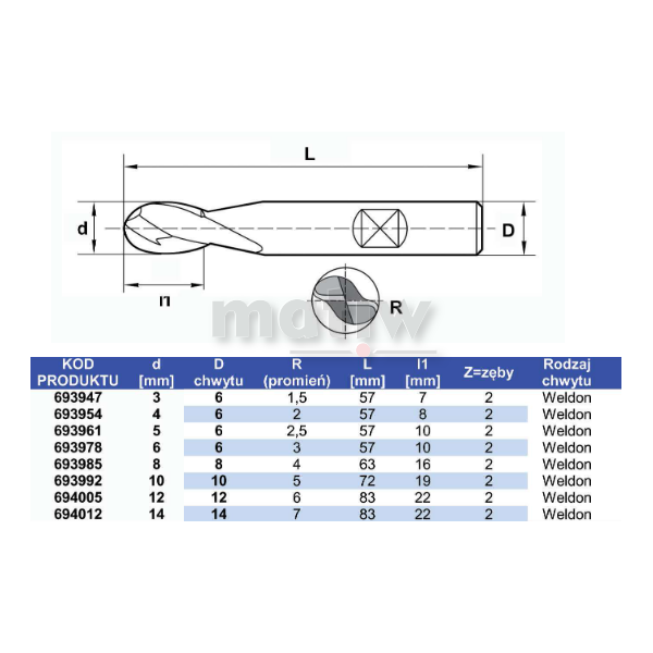 - Czoła frezów 2-ostrzowy z czołem kulistym