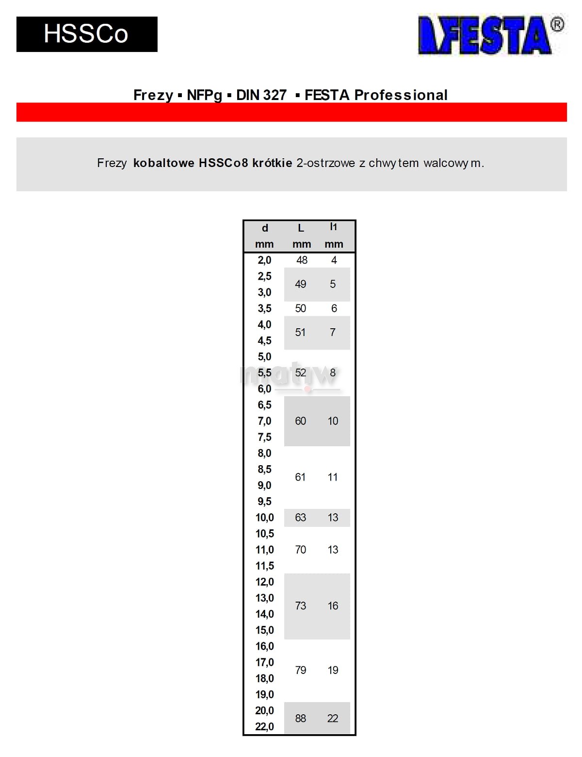 Frez trzpieniowy 2 HSSCo DIN 327 FESTA krótki 8,5mm