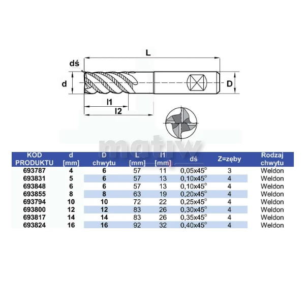 - materiał: VHM (węglik spiekany) z powłoką AlTiN (azotek tytanu i aluminium)