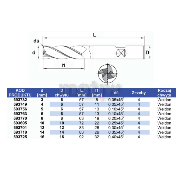 - DIN 6527L, chwyt DIN 6535 HB Weldon