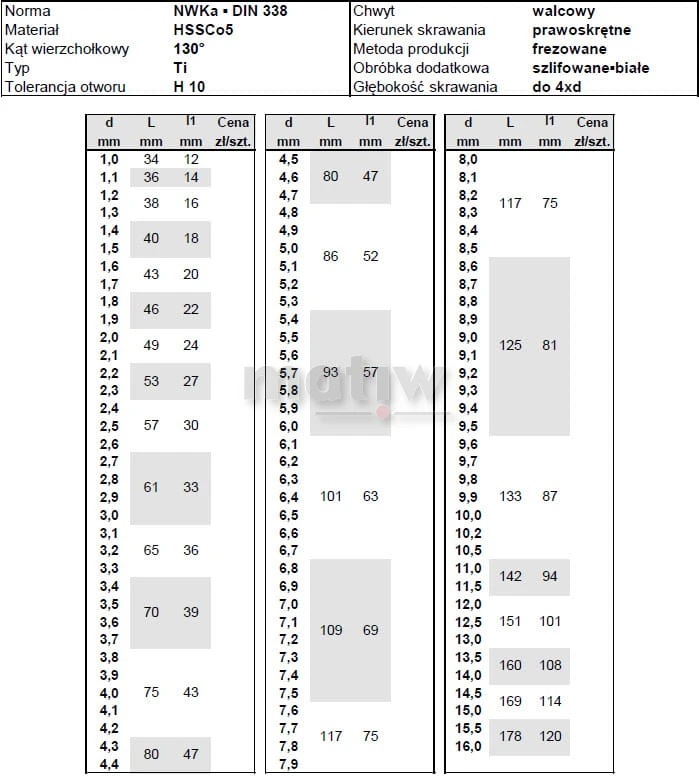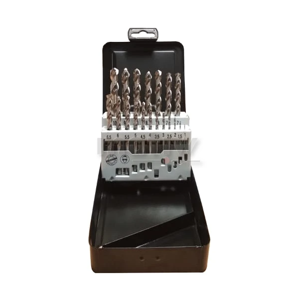 Zestaw profesjonalnych szlifowanych wierteł kobaltowych do metalu 1-10 mm co 0,5 mm, odpowiadających normie DIN 338. Bardzo wysoka wytrzymałość cieplna, prawoskrętne, szlifowane - białe, frezowane, kąt ostrzenia 135o, tolerancja otworu H10. Typ Ti. Chwyt walcowy.