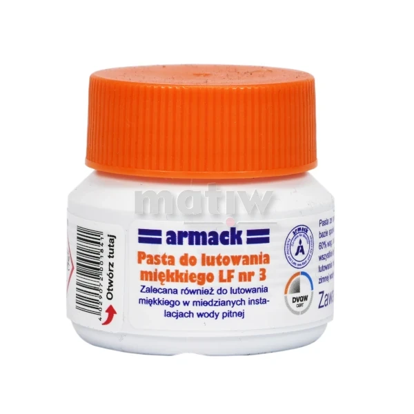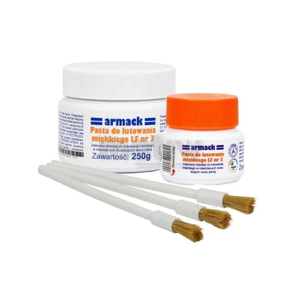 Pasta LF Nr 3 Armack 100 g to wysokiej jakości preparat przeznaczony do lutowania miękkiego rur i kształtek miedzianych w instalacjach wodnych i centralnego ogrzewania. Produkt jest kompatybilny z lutem miękkim Nr 3 i stosowany w systemach ciepłej i zimnej wody pitnej oraz instalacjach CO o maksymalnej temperaturze pracy do 110°C.