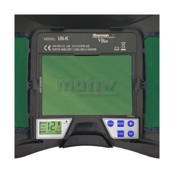 Przyłbica V8a umożliwia regulację stopnia zaciemnienia od 4 do 12 wg DIN, płynną regulację czułości reakcji fotoczujników na intensywność łuku podczas spawania, a także regulację czasu opóźnienia przełączania stanu ciemny/jasny i zmianę trybu pracy na szlifowanie. Filtr zaciemniający posiada najwyższą klasę optyczną zapewniając pełne bezpieczeństwo spawacza. Wyposażony jest w cztery fotoczujniki, co ma szczególne znaczenie podczas spawania niskimi prądami.
