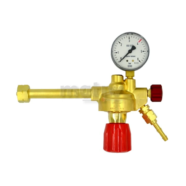 Reduktor butlowy PROPAN BUTAN RBGP-0,4-z PERUN, jednostopniowy z manometrem i zaworem odcinającym służy do obniżenia ciśnienia propanu-butanu pobieranego bezpośrednio z butli do wymaganego ciśnienia wylotowego (roboczego) w zakresie 0,2÷4 bar, nastawianego za pomocą śruby nastawczej przez użytkownika.