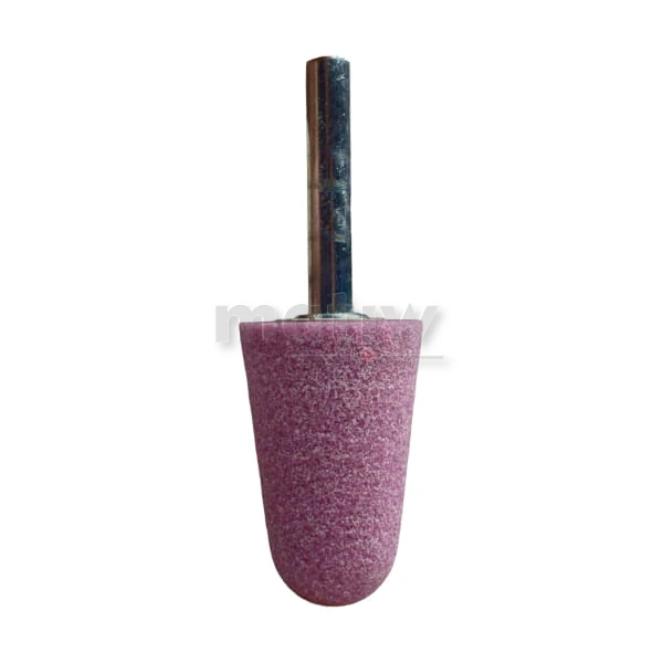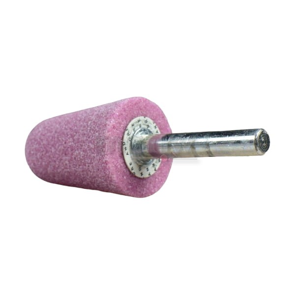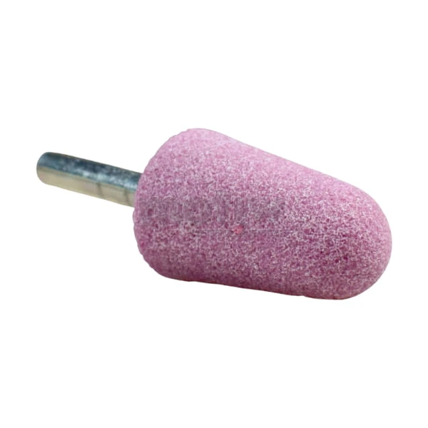 Ściernica trzpieniowa stożkowa (typ 5220) ze spoiwem ceramicznym, z ziarnem CrA - Elektrokorund chromowy (różowy). Charakteryzuje się dużą twardością i wytrzymałością, większą od elektrokorundu szlachetnego.