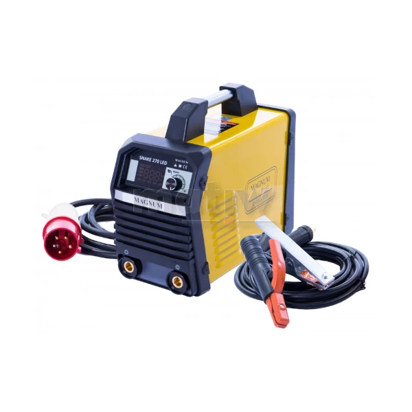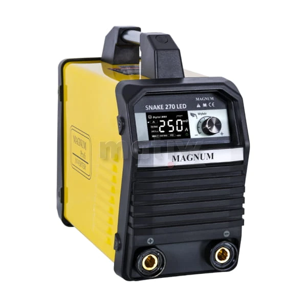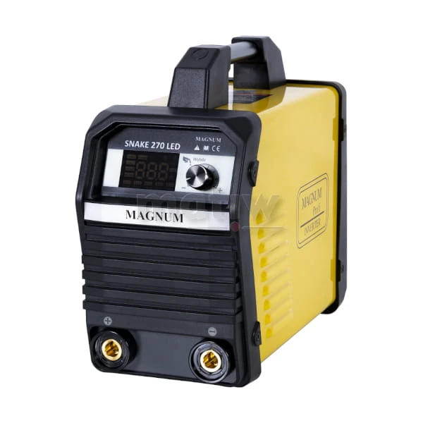 Urządzenie SNAKE 270 LED marki MAGNUM jest lekkim, przenośnym źródłem energii wykonanym w technologii inwertorowej. Urządzenie zasilane jest z sieci jednofazowej 230V, posiada maksymalny prąd spawania 250 A oraz wysoką 60% sprawność. SNAKE 270 LED wyposażony jest w duży multifunkcyjny, intuicyjny wyświetlacz LED.