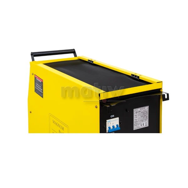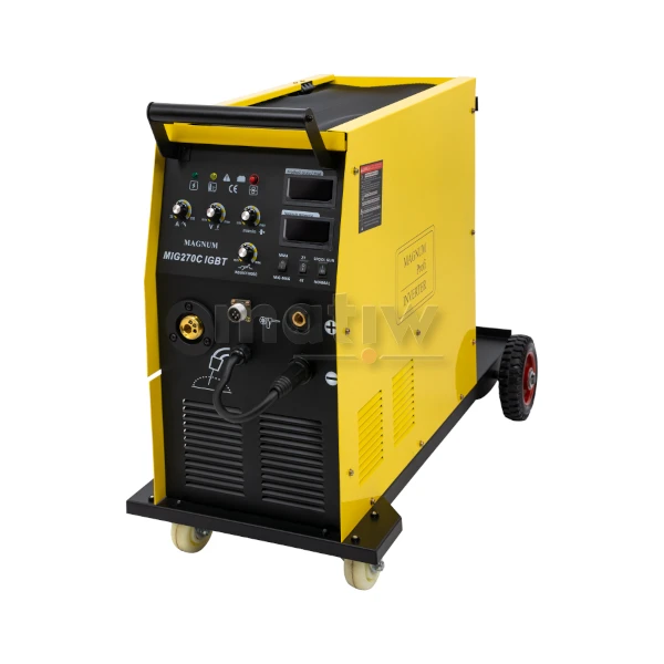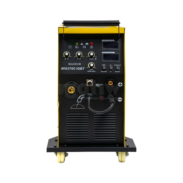 Urządzenie MAGNUM MIG 270C IGBT to profesjonalny półautomat spawalniczy zasilany z sieci trójfazowej 400V o maksymalnym prądzie spawania 270 A. Oferowany półautomat wykonany jest w technologii inwerterowej, wyposażony w cyfrowy wyświetlacz prądu i napięcia spawania.