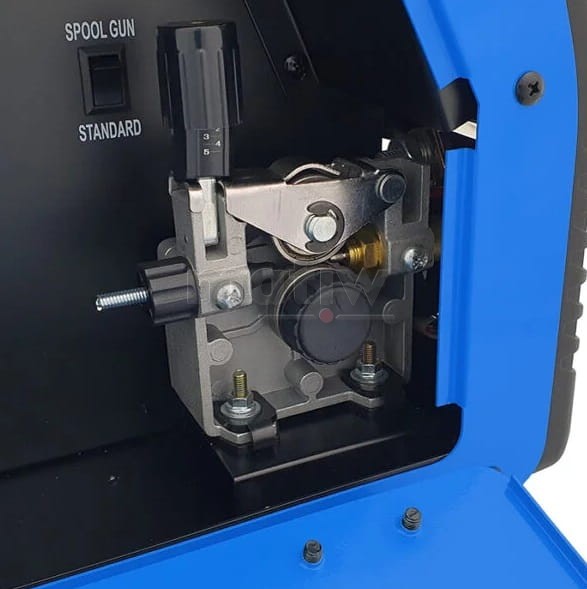 Spawarka umożliwia podłączenie uchwytu typu Spool Gun z zamontowanym w nim mini podajnikiem drutu i szpulą D100 drutu stalowego lub kolorowego. Wbudowany układ synergiczny pozwala dobrać parametry spawania mniej doświadczonym użytkownikom
