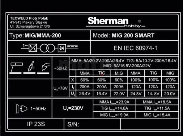 SPAWARKA MIGOMAT SHERMAN MIG 200 SMART SYNERGIA TIG MMA