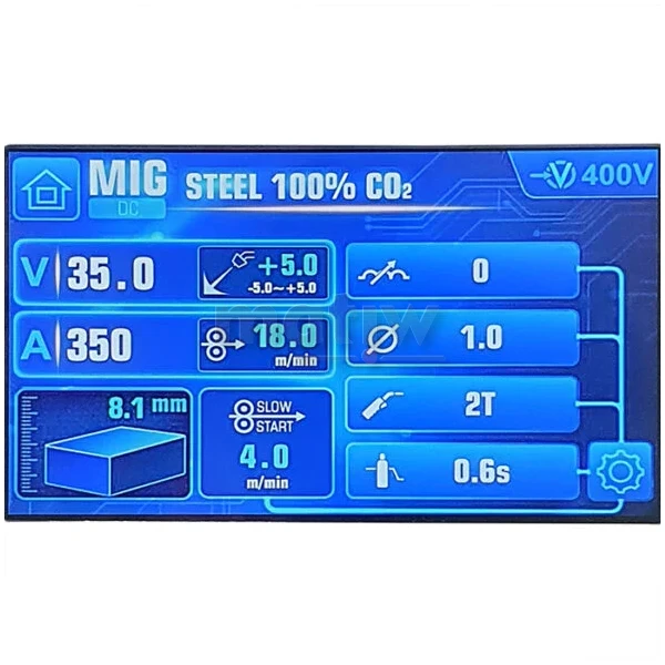 Cyfrowe sterowanie, bardzo duży (7”) kolorowy wyświetlacz LCD, intuicyjne menu i zastosowane w spawarce ustawienia synergiczne dla stali węglowej oraz stopów aluminium znacznie upraszcza jej obsługę.