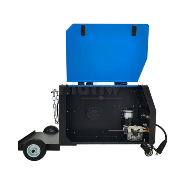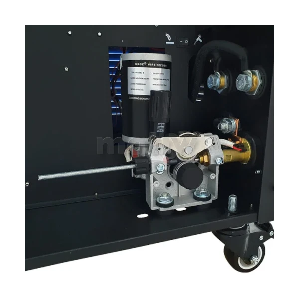 Urządzenie wyposażone jest w 2-rolkowy podajnik drutu z płynną regulacją prędkości podawania, uchwyt spawalniczy MIG, przewód elektrodowy oraz przewód masowy z zaciskiem kleszczowym.
