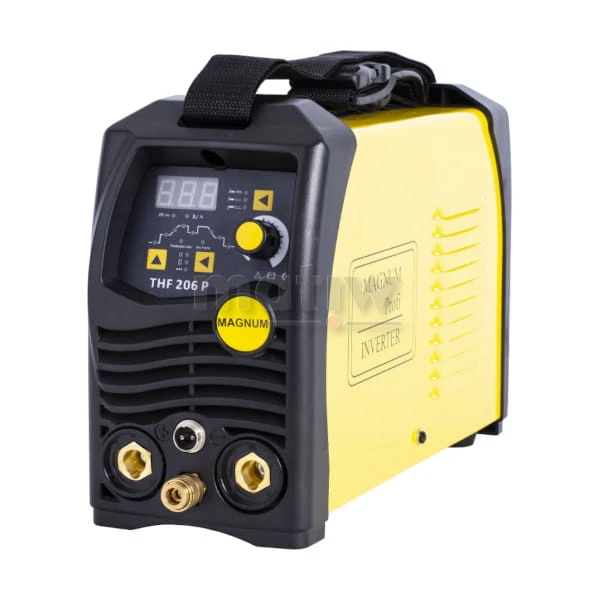 Urządzenie THF 206P marki MAGNUM jest lekką, przenośną spawarką inwertorową przeznaczoną do spawania metodą TIG HF (z bezstykowym zajarzaniem łuku spawalniczego) prądem stałym DC. zapewnia doskonałą wydajność w spawaniu stali niestopowej, niskostopowej, wysokostopowej, tytanu oraz innych spawalnych metali i stopów. Urządzeniem można również spawać metodą MMA z wykorzystaniem topliwych elektrod otulonych.