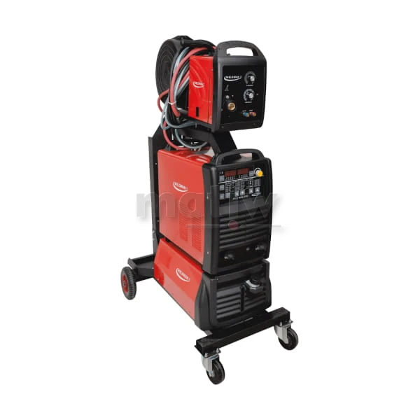 Przeznaczony do spawania drutami spawalniczymi o średnicy 0,8-1,6 mm, drutami samoosłonowymi 0,9 mm oraz elektrodami otulonymi o średnicy do 5 mm stali niskowęglowej, niskostopowej (MAG), stopowej (MIG), aluminium oraz odlewów żeliwnych. Max szpula 15 kg D300. Profesjonalny zewnętrzny 4-rolkowy podajnik drutu oraz zintegrowana chłodnica cieczy do chłodzenia uchwytu spawalniczego z wejściem/wyjściem na złączach Rectus typ 21 mini. Elektronicznie sterowana płynna regulacja prądu spawania oraz prędkości posuwu drutu. Tryb pracy uchwytu 2-takt/4-takt. Półautomat posiada dwa cyfrowe wyświetlacze parametrów prądu spawania (woltomierz, amperomierz). Miękki panel do separacji spawanego materiału i średnicy drutu w programach do spawania stali niskowęglowej i aluminium. Wbudowane programy synergiczne z możliwością korekty ręcznej wybranego programu. Wybór mieszanek gazu osłonowego.