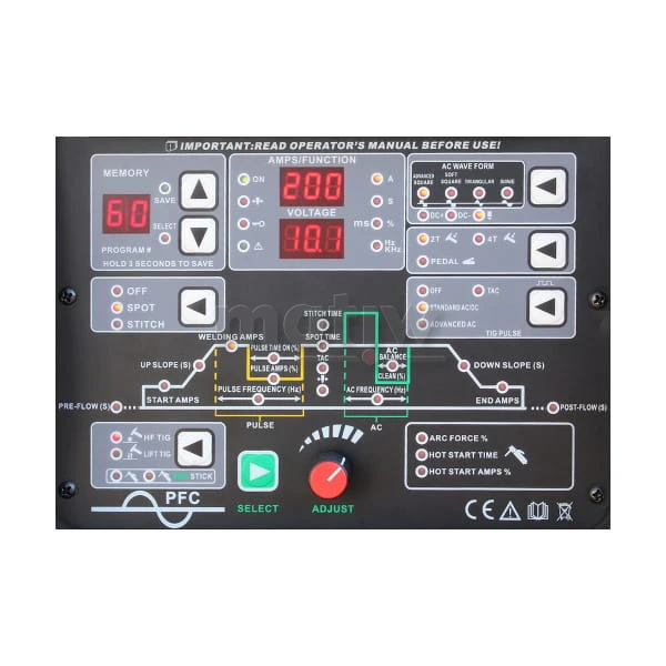 - TIG AC HF - analogiczna funkcja umożliwiająca spawanie aluminium prądem przemiennym, zajarzenie następuje bezstykowo poprzez prąd o wysokiej częstotliwości generowany przez jonizator,