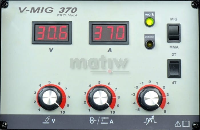 V-MIG 370 4x4 PRO MMA jest inwertorowym półautomatem spawalniczym przeznaczonym do spawania łukowego metodą MIG/MAG oraz MMA. Urządzenie zostało zaprojektowane do wykorzystania w użytku profesjonalnym. V-MIG 370 4x4 PRO stosowany jest do spawania aluminium i jego stopów, stali nierdzewnej oraz stali węglowych i niskostopowych. Spawanie odbywa się w osłonie gazu obojętnego bądź aktywnego. V-MIG 370 wyposażony jest w miernik cyfrowy (woltomierz, amperomierz) co pozwala na bieżąco kontrolować parametry spawania.