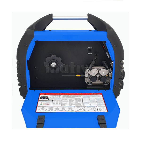 Spawarka fabrycznie skonfigurowana jest do spawania aluminium, w wyposażeniu znajduje się także wkład stalowy i rolka do spawania stali. W komplecie znajdują się także uchwyt spawalniczy MIG, przewód elektrodowy, przewód masowy oraz wąż przyłączeniowy do gazu ochronnego.