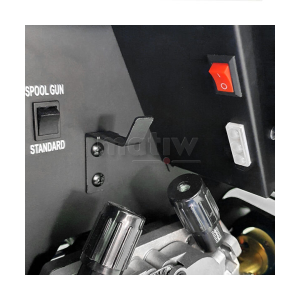 Urządzenie umożliwia podłączenie uchwytu typu Spool Gun (SG) z zamontowanym w nim mini podajnikiem drutu i szpulą D100 drutu stalowego lub kolorowego.