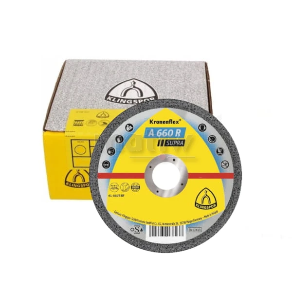 Tarcze do cięcia Kronenflex A 660 R Supra do stali szlachetnej charakteryzują się wysoką wydajnością cięcia i są przeznaczone do obróbki takich materiałów jak: stal szlachetna i stal. Właśnie w tych obszarach tarcze do cięcia z klasy Supra osiągają najlepsze wyniki. Produkty te posiadają bardzo wysoką agresywność, doskonałą żywotność i najlepsze właściwości pod względem twardości. Tarcza nie zawiera żelaza, siarki i chloru oraz charakteryzuje się niewielką skłonnością do tworzenia gratu. Jako wkładkę wzmacniającą zastosowano odpowiednio cienką siatkę z włókna szklanego. Dzięki temu nawet w tak cienkiej tarczy udało się uzyskać odpowiednio wysoki udział ziarna ściernego.