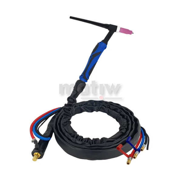 Do spawarek TIG, chłodzony cieczą, przyłącze typu Dinse. Do każdego uchwytu dodawany jest przybornik z częściami eksploatacyjnymi zawierający elektrodę, łącznik prądowy, tulejkę zaciskową, korek oraz dwie dysze ceramiczne.