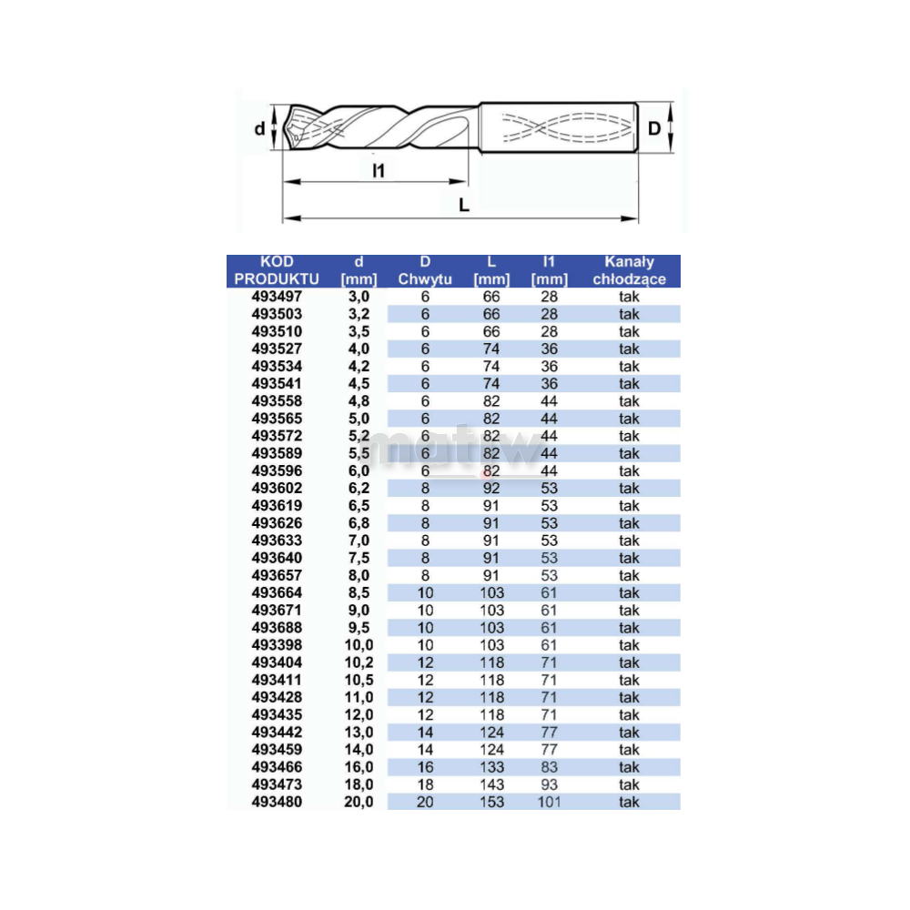 Wiertła węglikowe długie (5xD) z powłoką AlTiN (azotek tytanu i aluminium) odporną na utlenianie i pozwalające na pracę z wysokimi prędkościami skrawania. Wiertła wykonane z wewnętrznymi kanałami chłodzącymi. Sprawdzą się przy obróbce stali, stali nierdzewnej, żeliwa sferoidalnego itp. Produkt wysokiej wytrzymałości oraz dużej twardości charakteryzujący się wysoką odpornościa na zużycie. Przeznaczony do pracy na obrabiarkach o dużej stabilności mocowania.